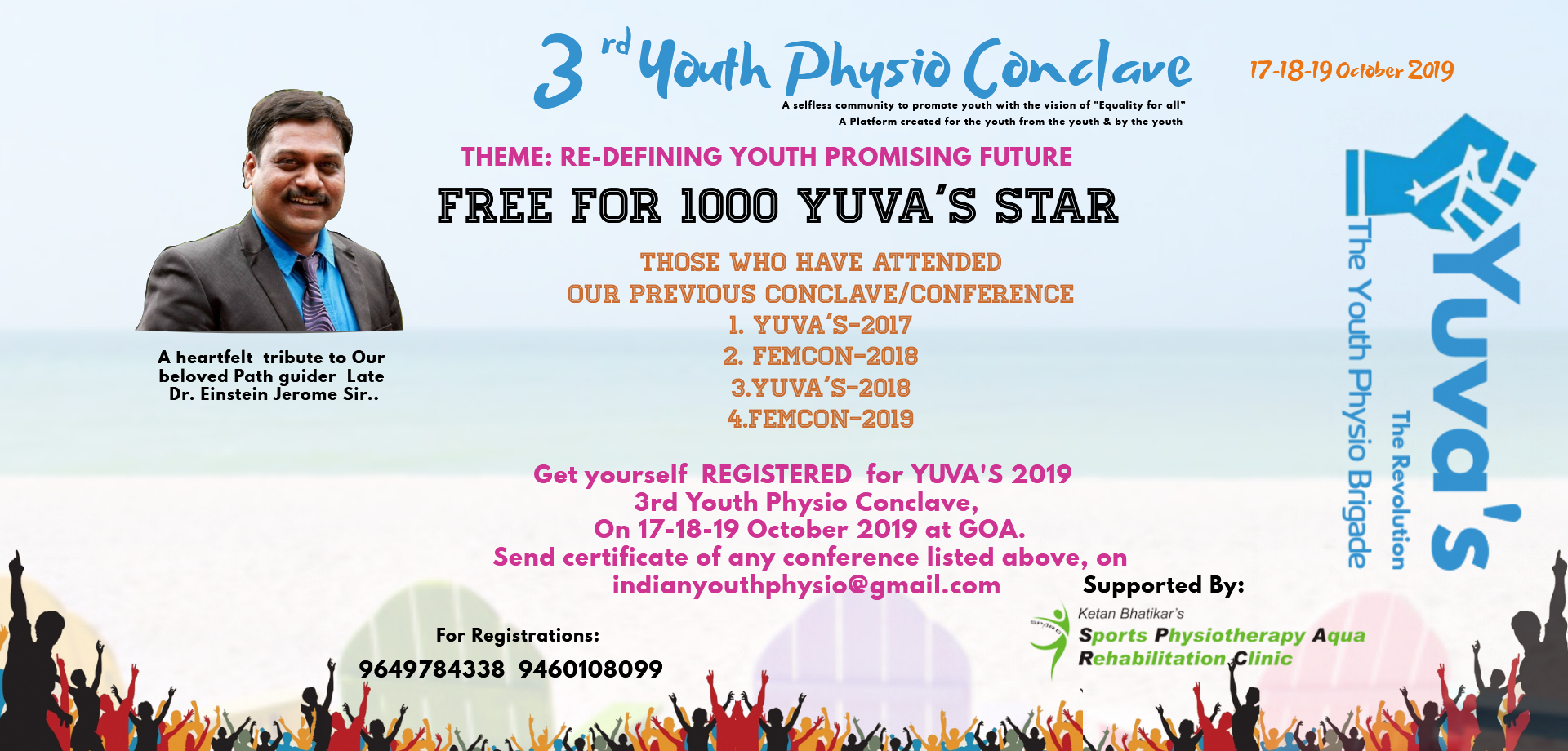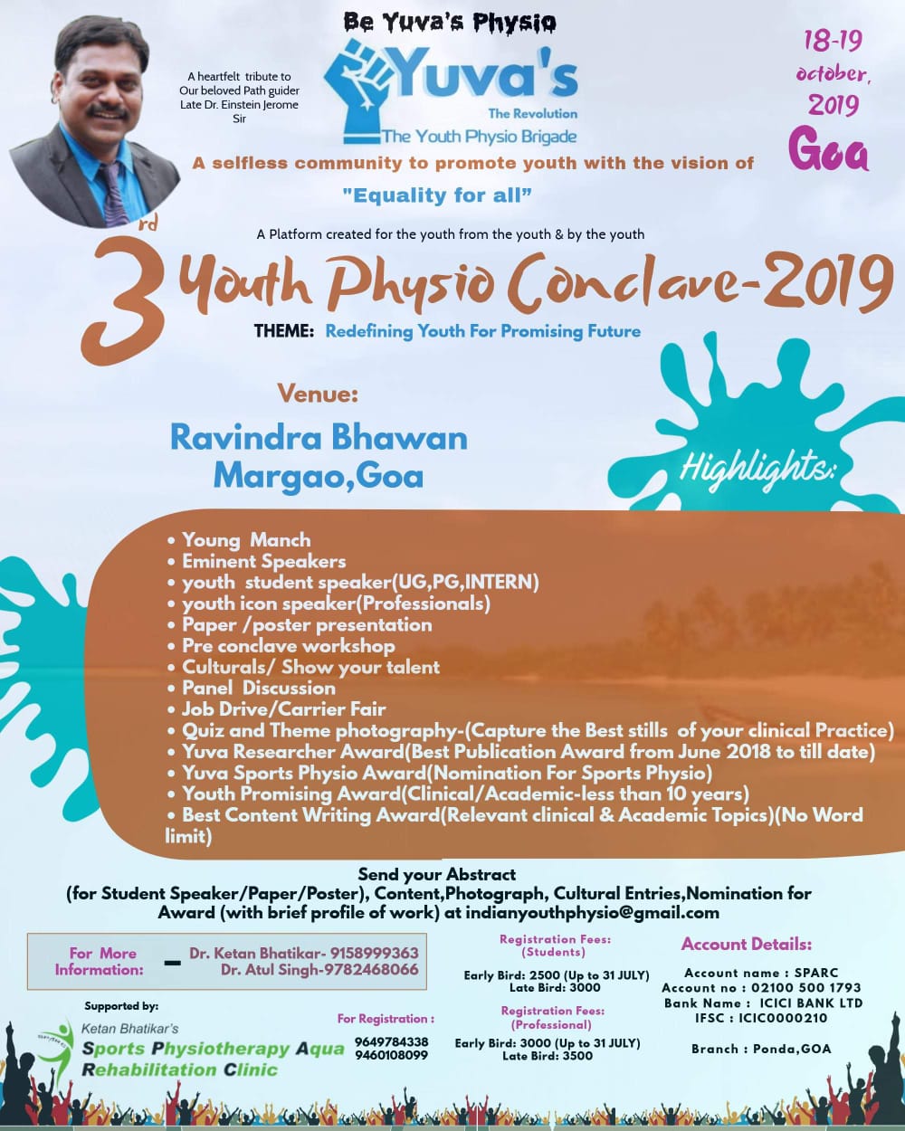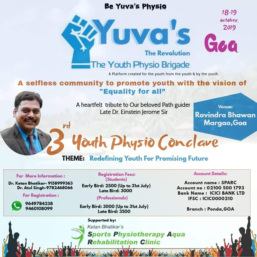 The organizing team of Youth Physio Conclave 2019 has scheduled the conclave to be organized on 17th ,18th & 19th October 2019 based on the theme " Redefining youth for Promising future " at Goa, India. Youth Physio Conclave promises to provide a platform to students to present recent achievements, researches, development in physiotherapy, innovative ideas and hands on techniques related to Physiotherapy and healthcare.